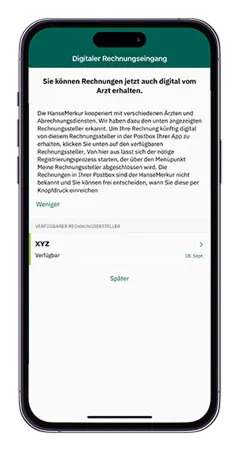 Sie können Rechnungen jetzt auch digital vom Arzt erhalten. Die HanseMerkur kooperiert mit verschiedenen Ärzten und Abrechnungsdiensten. Um zu prüfen, ob Rechnungen dieses Rechnungsstellers digital empfangen werden können, scannen Sie mit der App die Barcodes der Rechnung. Der Registrierungsprozess startet danach automatisch.